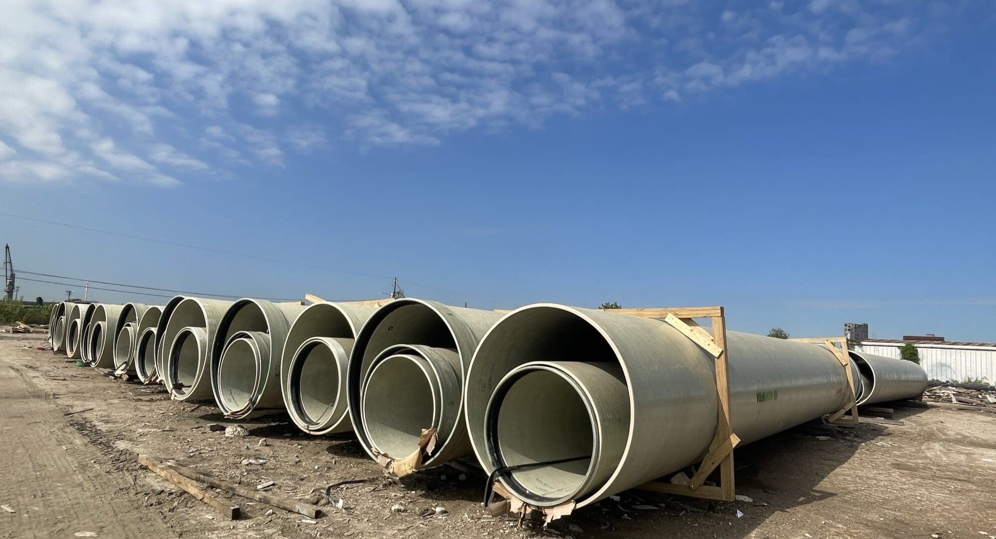 La construction a été réalisée principalement par excavation en tranchée ouverte, tandis que les segments de conduite situés dans des zones critiques ont été installés à l’intérieur de gaines en acier afin de protéger les réseaux existants contre les dommages potentiels causés par les activités de construction, les éléments naturels et les mouvements de sol. Des tuyaux renforcés en fibre de verre fabriqués par enroulement filamentaire continu (Continuous-Filament-Wound - CFW) de multiples diamètres : DN1000, DN1100 et DN1600 (36, 42 et 60 pouces) ont été fournis avec un manchon en PRV assemblé sur chaque conduite facilitant l’installation en chantier.